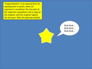 Fragmentation is a form of asexual reproduction in which a severed part of an organism can regrow into a whole new organism. The passage describes how a starfish that loses an arm through being attacked can regenerate its lost arm and also have the severed arm grow into an entirely new starfish, allowing the organism to reproduce without a sexual partner.