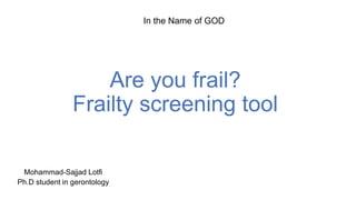 The document discusses various screening tools that can be used to assess frailty. It provides descriptions of 20 different frailty screening tools, including what components they assess (such as physical functioning, cognition, nutrition), how they are scored, and their validation results showing sensitivity, specificity and ability to predict frailty. It also includes links to online calculators for tools like the SHARE Frailty Index and provides examples of how to interpret the scores from tools like the Groningen Frailty Index.
