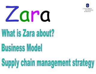 This document summarizes Zara's business model. Zara is a Spanish apparel retailer known for its ability to quickly translate fashion trends into new designs and get them to stores within 2 weeks. It achieves this through vertical integration and a flexible manufacturing model. Key aspects of the Zara model include designing 11,000 new styles per year, producing in small batches, and replenishing stores twice weekly based on sales data to maintain scarcity. Both in-house and outsourced production is located in Europe for speed. Zara's pricing is market-based rather than cost-based and it relies on word-of-mouth over advertising.