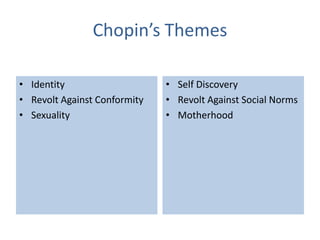 Kate Chopin was an American author who wrote ahead of her time about themes of female identity, self-discovery, and revolt against social norms and conformity in her controversial 1899 novel The Awakening. The novel featured the character Edna Pontellier and her awakening to female sexuality and independence in a male-dominated society. Though Chopin sought to accurately depict lives of women in 19th century America, the novel was socially ostracized and Chopin died in 1904 with her work largely ignored until the feminist movement brought renewed attention to The Awakening.