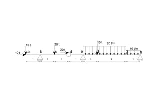 This document involves solving a system of equations for the forces and torques acting on a structure. It finds that the vertical forces are yb = 32.5 tons, ye = 53.125 tons, and yh = 34.375 tons by setting the sum of the torques equal to zero at two points and the sum of the vertical forces equal to the total load. It verifies the solution by checking the sum of torques at a third point is also equal to zero.