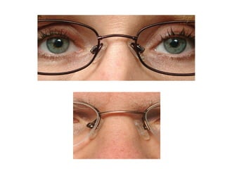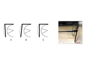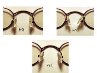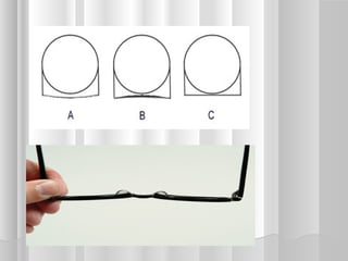 This document discusses frame adjustment and quality checking. It describes 7 off-face adjustments including x-ing, temple spread, pantoscopic angle, temple fold angle, pad angles, face form, and 4-point touch. It also discusses 7 on-face adjustments including horizontal alignment, vertex distance, frame height, segment height, temple bend, pad contact, and skin/lash clearance. Key details are provided about properly adjusting specific angles and alignments during the fitting process.