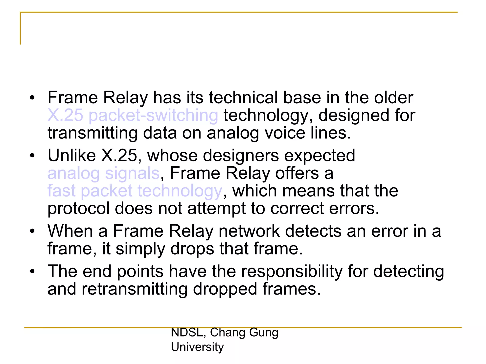 Frame Relay is a packet-switching protocol used to transmit data over wide area networks in an efficient manner. It segments data into variable length frames and leaves error correction to end points, allowing for faster transmission. Frame Relay provides permanent virtual circuits to make connections appear dedicated while allowing dynamic routing of frames.