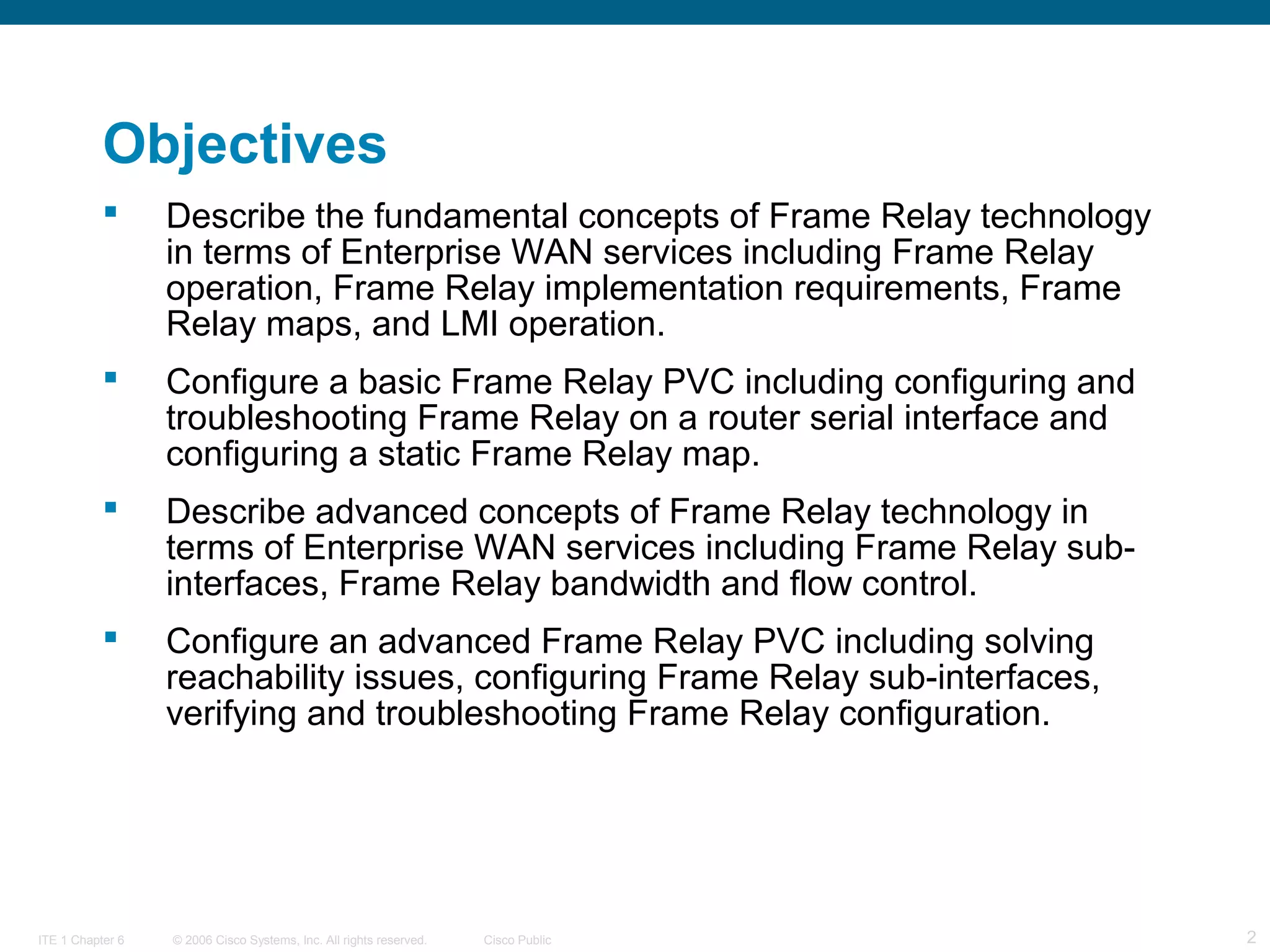 The document provides an overview of frame relay technology, focusing on its fundamental concepts, configuration, and advanced implementation techniques for enterprise WAN services. It outlines basic and advanced PVC configurations, including troubleshooting and utilizing virtual circuits. Additionally, it explains LMI operations, bandwidth control, and flow control within frame relay networks.