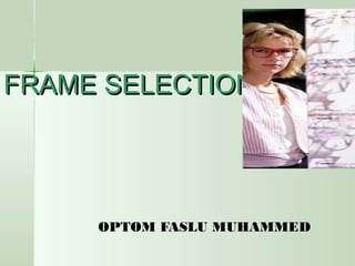 This document provides guidance on frame selection and fitting based on facial features. It discusses factors to consider when using a wearer's old frame versus a new frame. It describes the seven basic facial shapes and recommendations for frame styles that complement each shape. Details are given on how frame color, weight, bridge design, and temple length can be selected based on facial characteristics to provide the best fit. Adjustable nose pads and bridge positioning are also covered to ensure comfort and proper weight distribution for the frame.