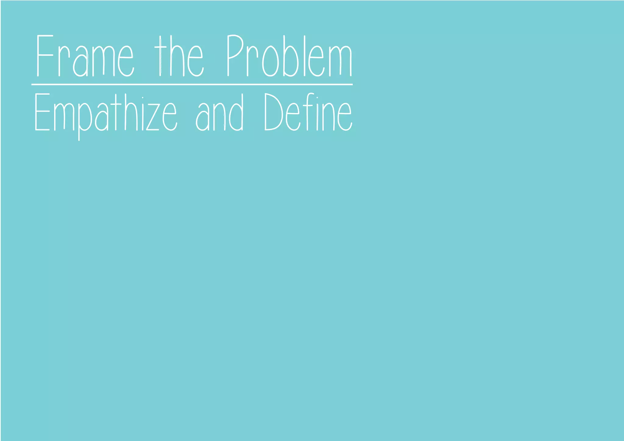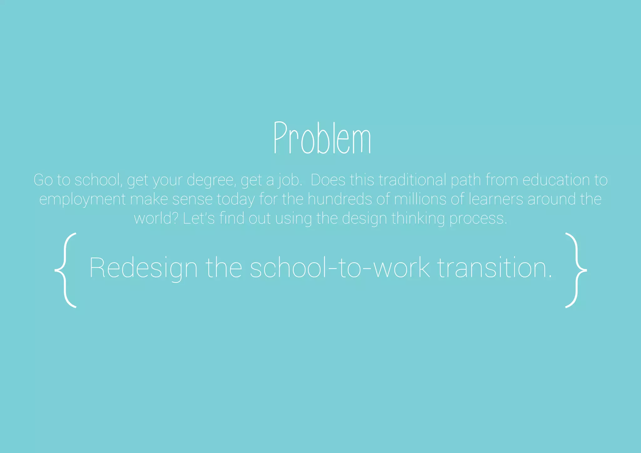 The document frames redesigning the school-to-work transition using design thinking. It profiles a 23-year-old recently graduated industrial design student in Mexico who is looking for work. An empathy map outlines her thoughts, actions, and feelings, including difficulties finding a job that utilizes her degree and matches her interests due to lack of experience. The problem statement identifies her as a creative, team-oriented industrial designer seeking a way to start working on interesting design projects despite lacking work experience.
