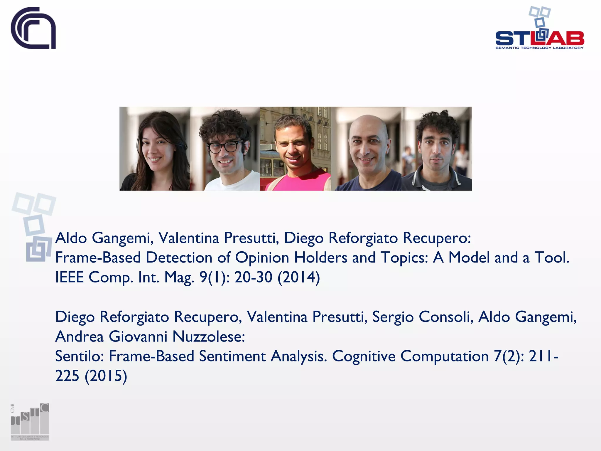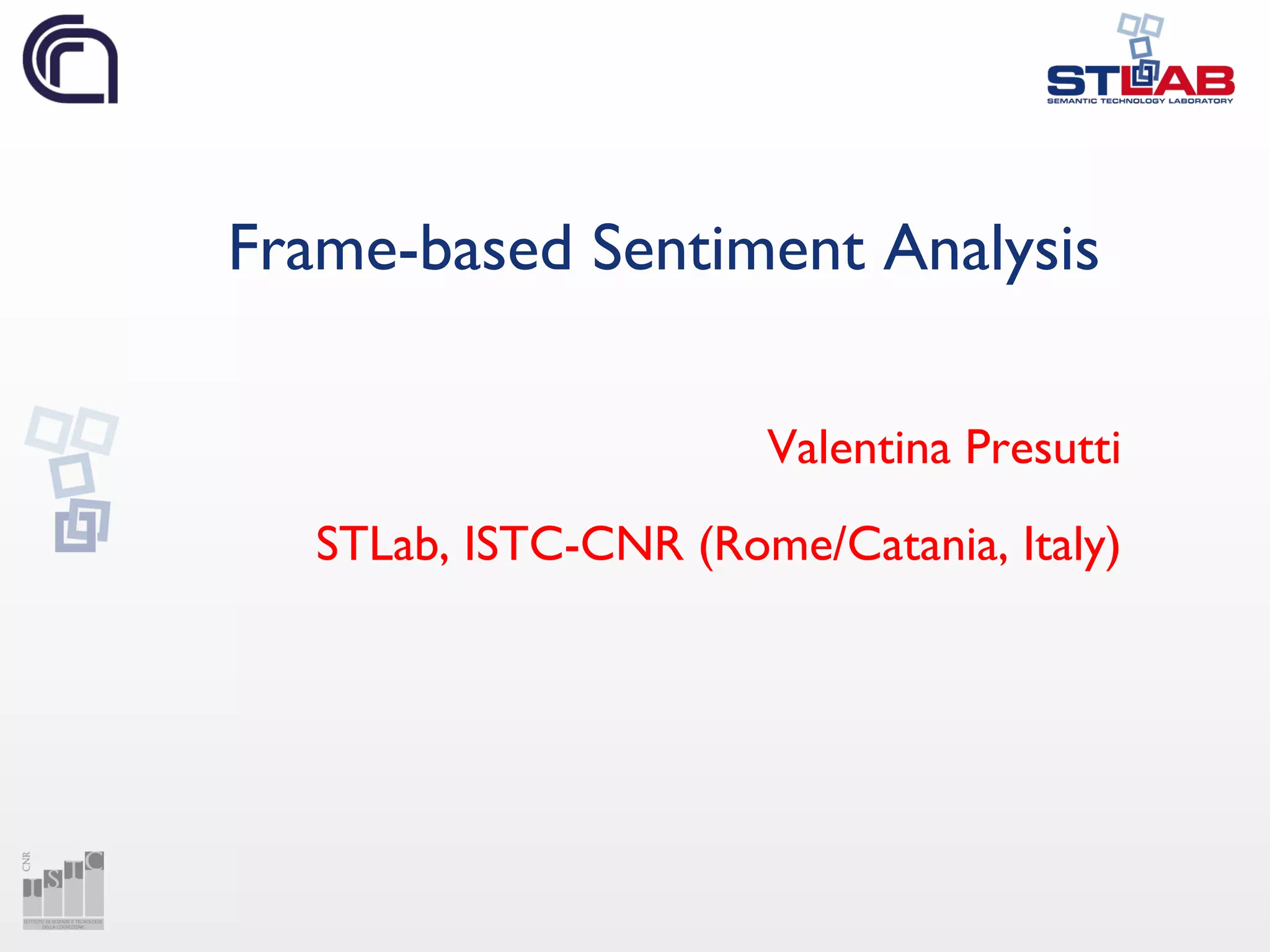 The document discusses frame-based sentiment analysis, focusing on modeling opinions and extracting sentiment from unstructured text through quintuples that represent entities, aspects, sentiment values, opinion holders, and time. It explores techniques for indirect sentiment analysis and the use of ontologies and semantic features to enhance sentiment detection and interpretation. Key components include tools and models like Sentilo, OntoSentilo, and SentiloNet, along with addressing issues such as topic detection and sentiment propagation.