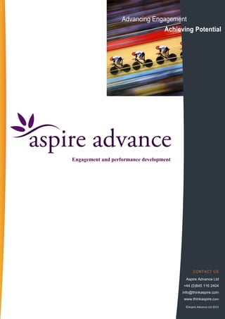 Aspire Advance Ltd specializes in performance development and engagement programs through person-centric coaching and tools like their proprietary frames® model. The company offers various services targeting public and private sectors, including training, consulting, and customized development solutions aimed at fostering positive change and enhancing employee engagement. Their flagship products, frames® launch and frames® advance, provide scalable, cost-effective self-assessment and facilitated development options to achieve peak organizational results.
