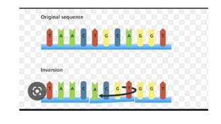 Frameshift mutations are caused by the addition or deletion of DNA bases, shifting the reading frame of codons from the mutation site onward. There are two types: deletions caused by losing bases, and insertions caused by adding extra bases. These mutations can originate from errors in DNA replication or damage from mutagens like acridine dyes. Chromosomal aberrations like translocations, deletions, duplications, and inversions are also a type of mutation and result from breaks in chromosomes that cause structural changes. Translocations transfer parts of one chromosome to another, while deletions, duplications, and inversions involve the loss, repetition, or reversal of chromosomal segments.