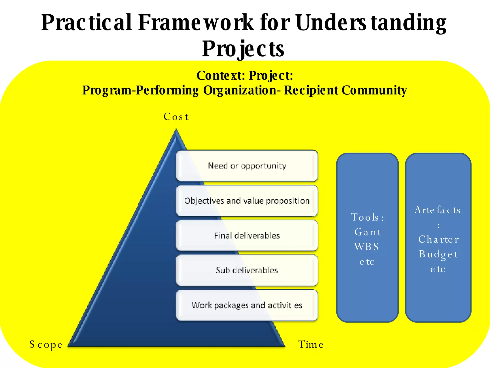 This document provides a framework for understanding a project's context including the project itself, the performing organization, and the recipient community. It lists key factors such as scope, cost, time, as well as tools like Gantt charts and work breakdown structures, and artifacts like charters and budgets that are important for defining a project.