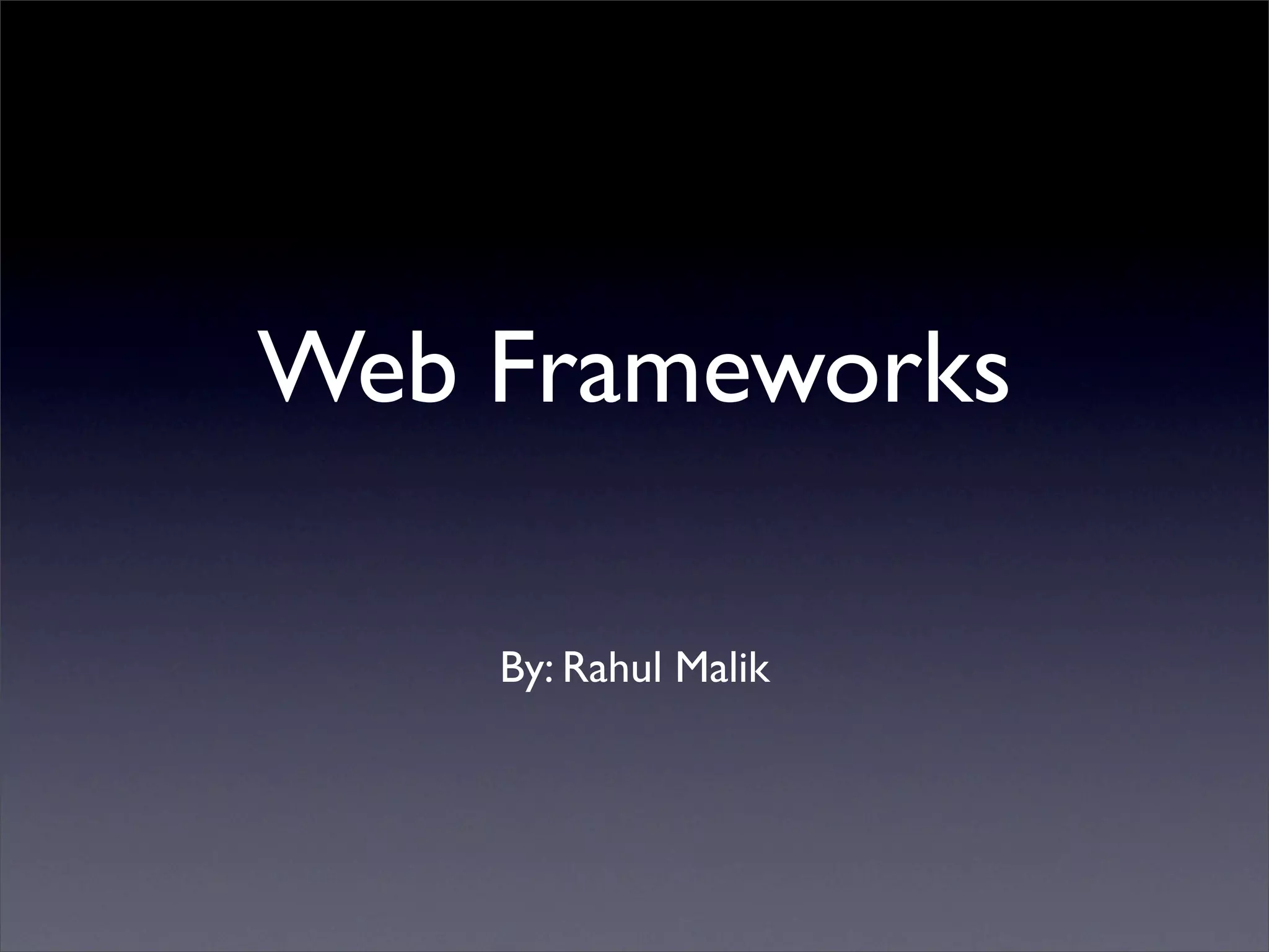 Web frameworks like Ruby on Rails and Django were created to simplify web development and address common problems. They utilize the Model-View-Controller pattern to separate the database, user interface, and application logic. This improves scalability and maintainability. Frameworks automate common tasks, provide built-in security features, and allow mapping of URLs to code for flexible routing. While not perfect solutions, web frameworks streamline development by handling infrastructure concerns so developers can focus on their specific applications.