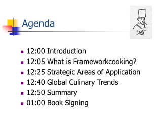This document outlines a presentation on frameworkcooking, a methodology for culinary evolution and innovation. The presentation covers: an introduction to frameworkcooking and its six unique characteristics; areas of strategic application including cultural cuisine, fusion, food labels, and nutrition menus; global culinary trends like sustainability and superfoods; and a summary of related global initiatives and the author's background.
