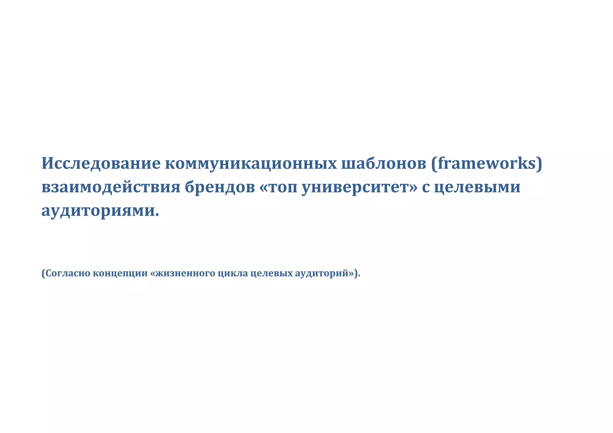 Документ представляет собой исследование коммуникационных шаблонов взаимодействия брендов 'топ университет' с целевыми аудиториями, основанное на концепции жизненного цикла аудиторий. В нем анализируются основные бренды, такие как Гарвард, MIT, Стэнфорд и Токийский университет, с рекомендациями для Уральского Федерального Университета по разработке стратегий коммуникации и присутствия в медиа. Исследование включает обширные данные о медийных стратегиях и коммуникационных рамках, необходимые для эффективного взаимодействия с различными целевыми группами.