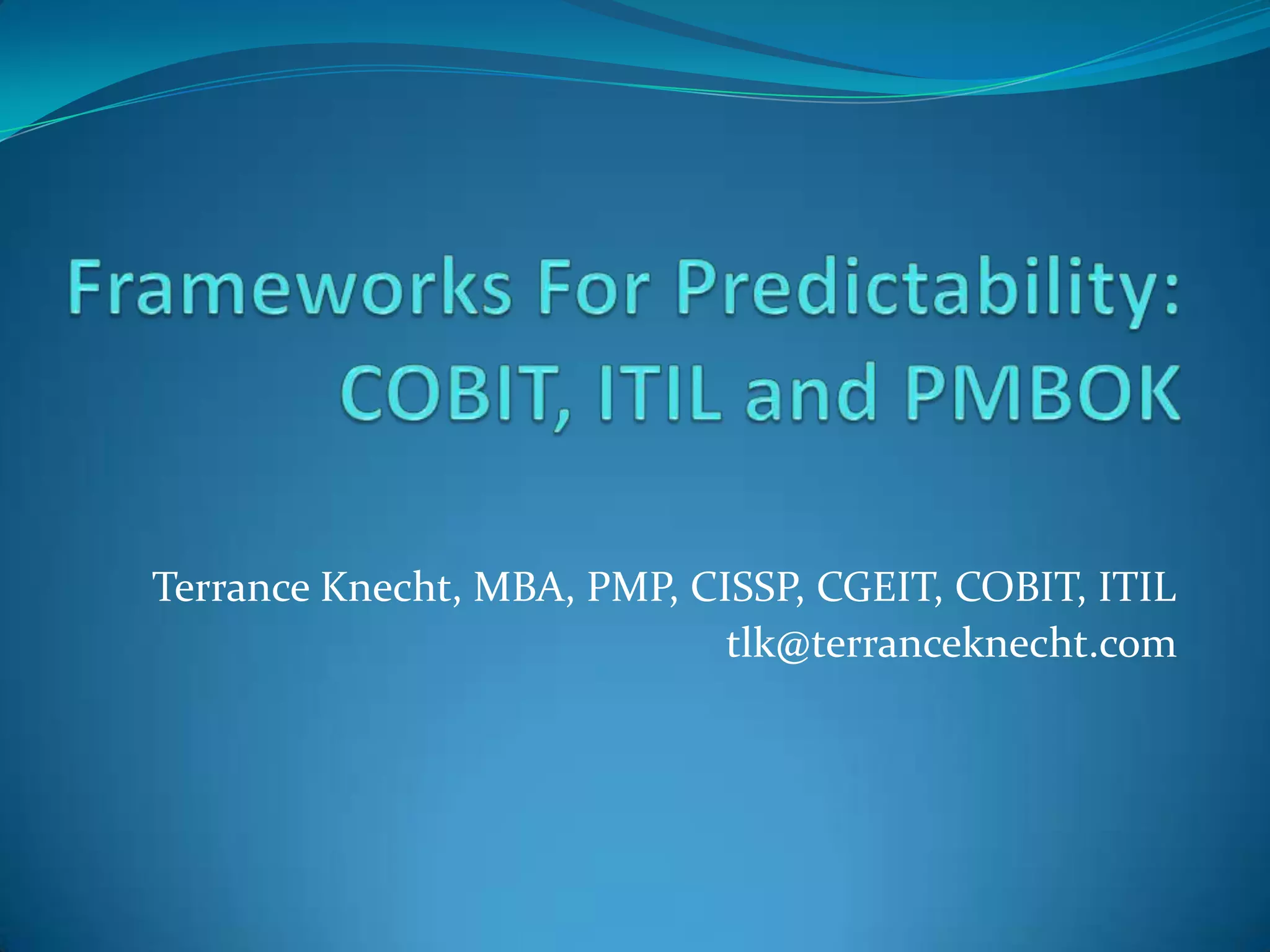 Terrance Knecht has extensive experience leading IT organizations across multiple industries. He is currently consulting at ZS Associates working on a project for Amgen. Knecht advocates for using established frameworks like COBIT, ITIL, and PMBOK to bring structure and acceptance to IT processes and projects. These frameworks provide best practices for areas like governance, service management, and project management that can be evaluated for maturity.