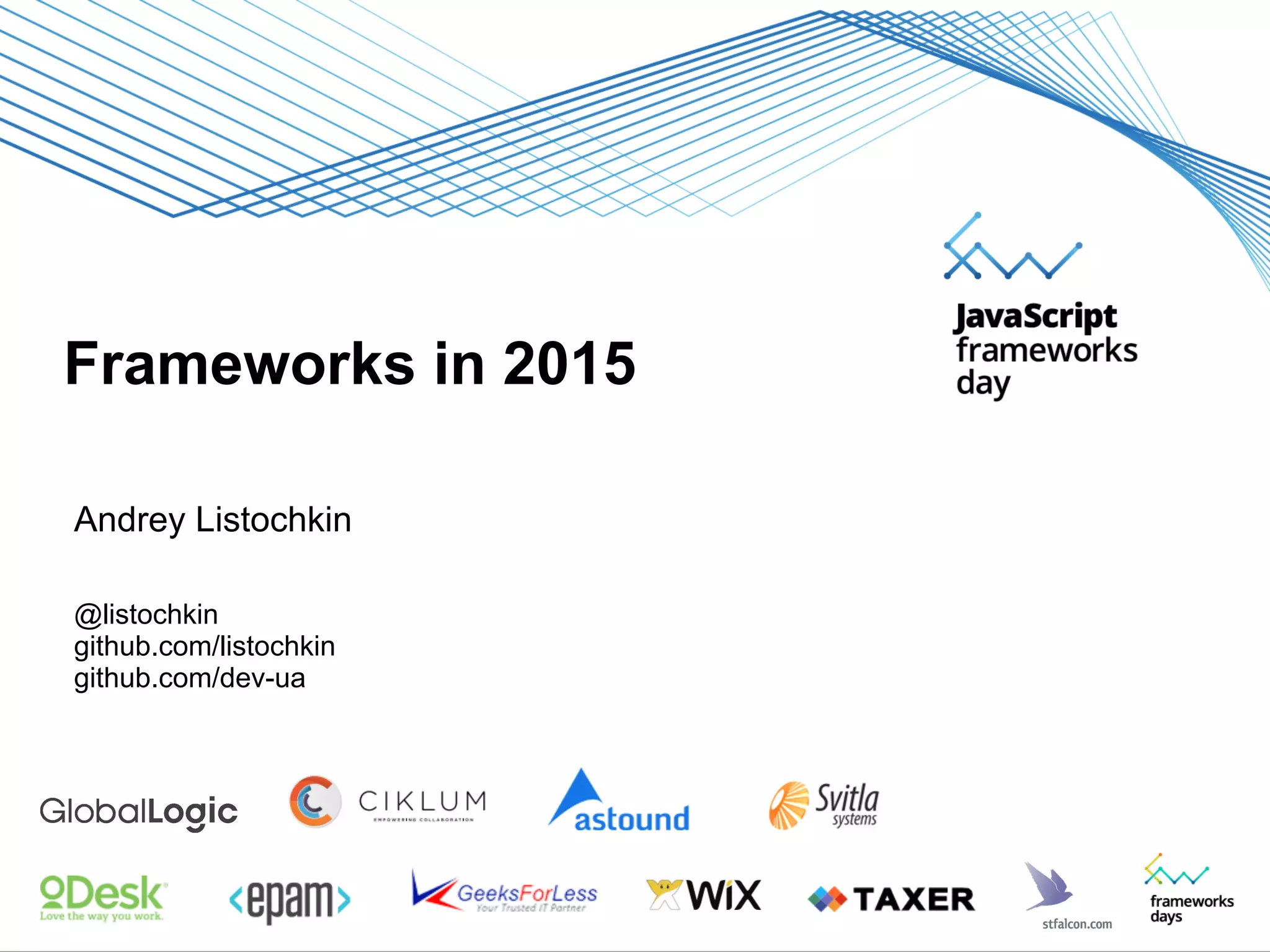 The document discusses various JavaScript frameworks from 2015, focusing on their architectures, ecosystems, and comparative aspects. It highlights trends in unidirectional data flow, component-based design, and the challenges of open-source collaboration. Additionally, it delves into specific frameworks like Angular, React, and Ember, examining their respective tools, testing methods, and future trajectories in web development.