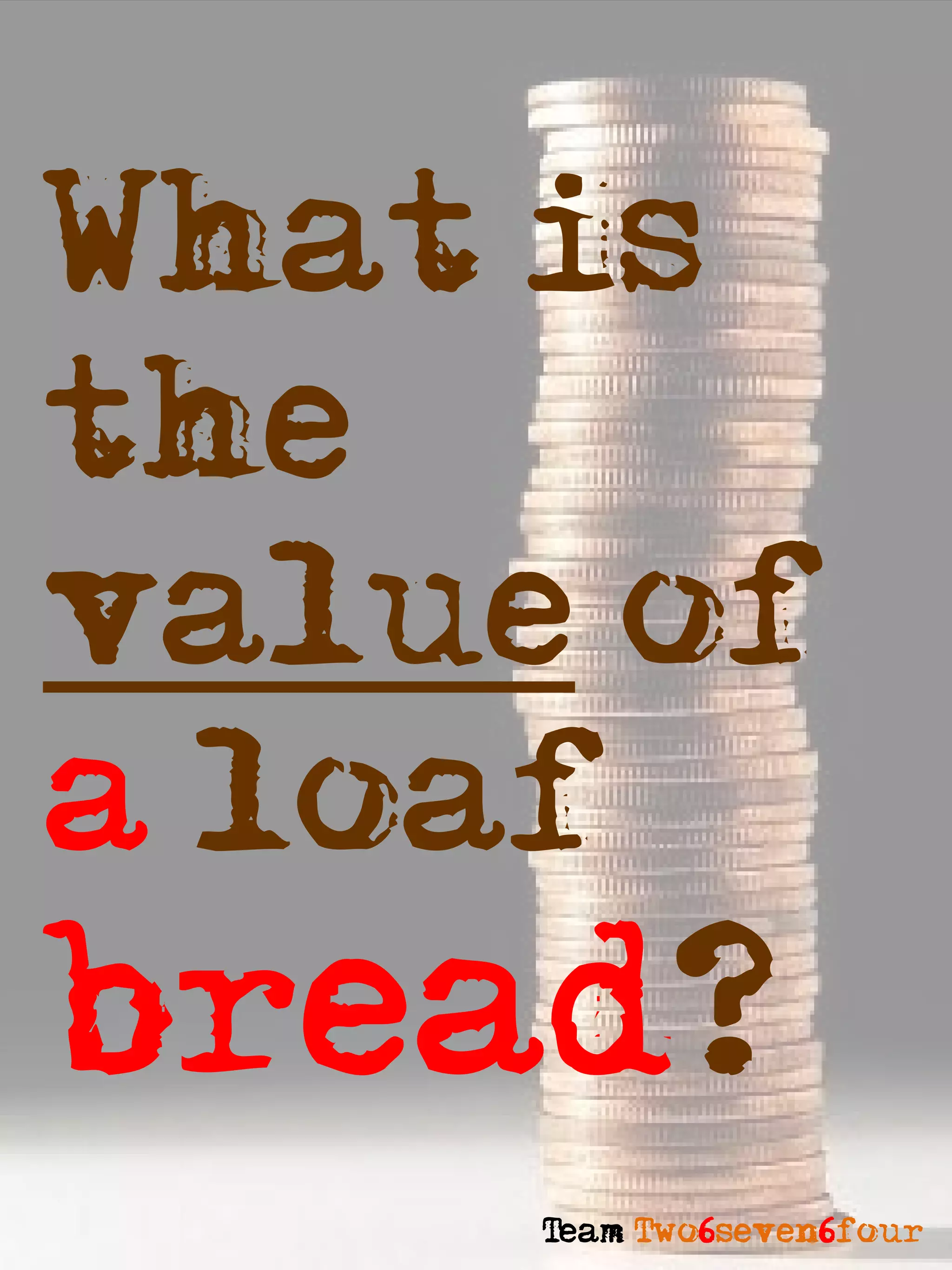 This document discusses the value of a loaf of bread from different perspectives. A typical loaf of bread costs around $2-3 USD/AUD and contains approximately 850 grams yielding at least 17 slices. The value of bread depends on the holder but it can feed 200 fish that could be sold for $17.99-18.76/kg, 17 hungry ducks, or make one sandwich to feed a homeless person. Globally, one loaf could save starving children or victims of natural disasters by providing nourishment.
