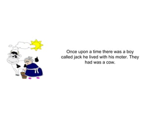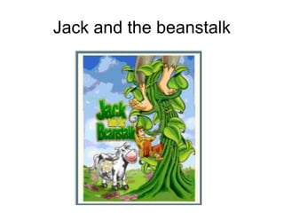 Jack lived with his mother and cow. He traded the cow for magic beans which his mother threw out the window. The beans grew into a giant beanstalk that Jack climbed. At the top was a castle where Jack found a magic hen and harp. When the giant woke, Jack grabbed the items and climbed down as the giant chased him. Jack's mother chopped down the beanstalk, killing the giant. Jack and his mother then lived happily ever after with the magic items.