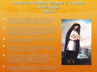 The document discusses the French colonial empires of Canada and Louisiana. It describes the French efforts to convert Native Americans in Canada to Christianity to facilitate the fur trade, and the conflicts that arose between missionaries and tribes who wanted to prioritize trade. It also discusses the Iroquois wars over captives and territory, as well as the development of the fur trade between Europeans and Native Americans. The document then summarizes the loss of the Quebec colony to the British in 1629, French settlement in Canada, and the founding and difficulties of developing Louisiana as a French colony in the late 1600s-early 1700s.