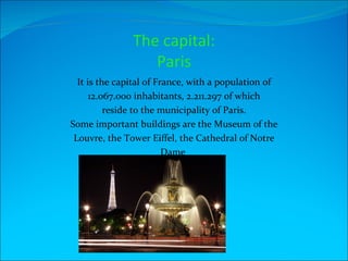 France's capital is Paris, with a population of over 12 million. Some iconic landmarks include the Louvre Museum, Eiffel Tower, and Notre Dame Cathedral. The country speaks French and is known for foods like cheese, wine, and champagne. In addition to Paris, other major cities include Marseille and Montpellier. The climate varies from cold winters to warm summers. Famous monuments that attract many visitors are the Eiffel Tower, Notre Dame Cathedral, Arc de Triomphe, and the Louvre Museum.
