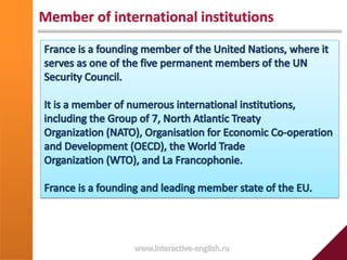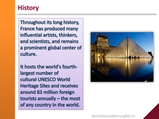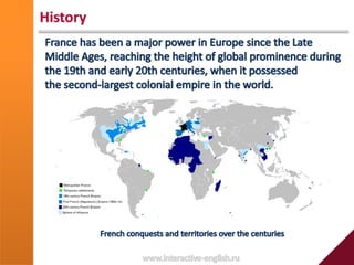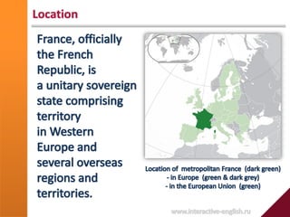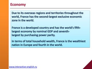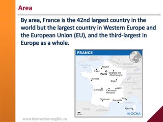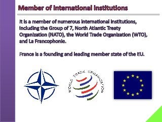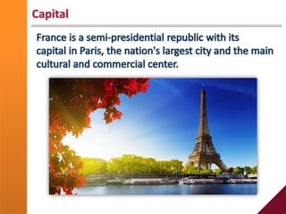 This presentation is about France. You'll know about its location, area, population, capital, history, economy, human development etc.