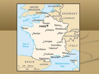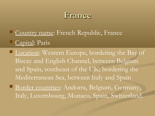 This document provides a detailed overview of France, including its geography, history, culture, and major cities and attractions. It discusses France's location in Western Europe and bordering countries. It then summarizes key facts about France's government, population, languages, religions, economy, and currency. The document proceeds to describe major attractions in different regions of France, including Paris, Normandy, the Loire Valley, Provence, the French Riviera, and others. It highlights famous landmarks, museums, cathedrals, and other cultural sites throughout the country.