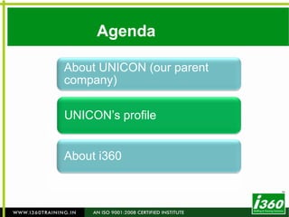 This document provides information about a training organization called i360 that offers vocational training programs through a franchise model. It discusses i360's parent company, which has over 900 branches across India. i360 offers over 250 training programs in various fields like spoken English, financial courses, retail management, and IELTS preparation. It is looking for franchise partners to open training centers and has outlined the roles and responsibilities of the franchisor and franchisee. The document discusses the business model, expected costs, and the benefits of partnering with i360 such as internationally recognized curriculum, placement assistance, and marketing support from i360.