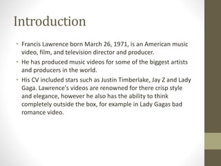 Francis Lawrence is an American music video and film director known for directing videos for major artists like Justin Timberlake, Jay-Z, and Lady Gaga. His music videos are renowned for their crisp style and elegance. Some of his most famous videos include "Cry Me a River" for Justin Timberlake, "I'm a Slave 4 U" for Britney Speers, and "Bad Romance" for Lady Gaga, though his style ranges from sexually oriented to quirky depending on the artist. Lawrence is also known for directing the iconic music video for Aerosmith's "I Don't Want to Miss a Thing".