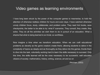 The document explores the educational potential of collaborative computer games, particularly focusing on the Halo game series and the social dynamics involved in its gameplay. It discusses how video games can engage players, promote teamwork, and facilitate learning in a way that traditional education often fails to achieve. The research emphasizes the importance of creating immersive learning environments that encourage creativity, collaboration, and problem-solving skills among players.