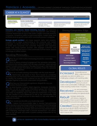 Acevedo's international experience working in Latin America helped him learn how to motivate teams and adapt his leadership given local differences and economic situations. His leadership style emphasizes accountability, strategic direction, enabling teams by matching talents to meaningful tasks, and creating a positive work environment.