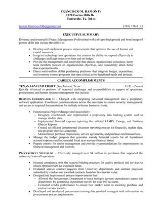 Francisco M. Ramon IV has over 15 years of experience in project management, procurement, budget management, and business operations. He has advanced through positions with increasing responsibility at Texas A&M University and Brooks-City Base, managing multi-million dollar budgets and implementing process improvements. Ramon holds degrees in Business Management and has received professional certifications in project management, procurement, and business development.