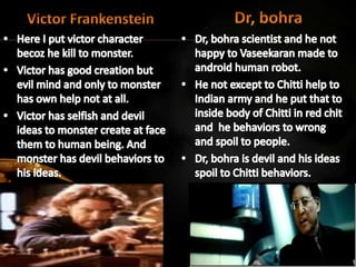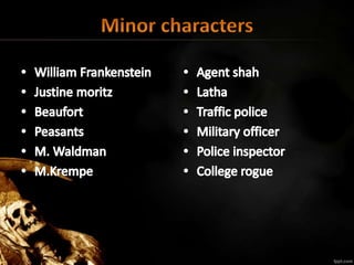 The document references characters from Mary Shelley's 'Frankenstein' including Victor Frankenstein, the monster, and Elizabeth Lavenza. It also mentions related figures and contexts, suggesting a discussion about the themes or implications of the story. The inclusion of names and roles indicates a focus on the relationships and dynamics between these characters.
