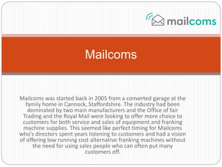 Mailcoms, founded in 2005 in Cannock, Staffordshire, aimed to provide low-cost franking machines to enhance customer choice in the mailing industry. The company offers several models, including the Mailstart+, Mailbase Lite, Mailbase, and Mailbase Pro, each designed for varying daily letter volumes and featuring capabilities like online usage accounting and built-in scales for precise postage. By introducing these alternatives, Mailcoms seeks to simplify the mailing process and improve office efficiency.