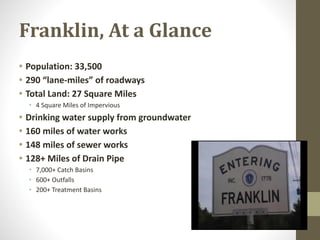 The document provides an overview of the public works budget for Franklin, including details on funding, staffing, and regulations as of January 2022. It outlines the operating and capital budgets for various divisions, highlighting significant backlogs in roadwork and maintenance, as well as funding and staffing challenges. Regulatory compliance concerns regarding drinking water quality and anticipated costs are also noted.