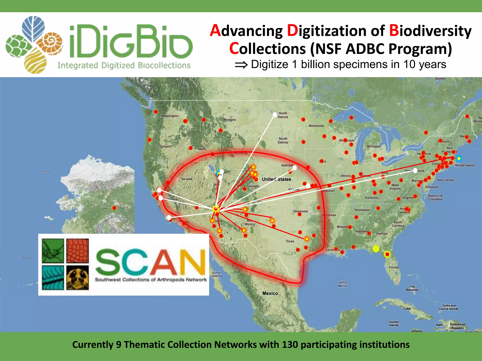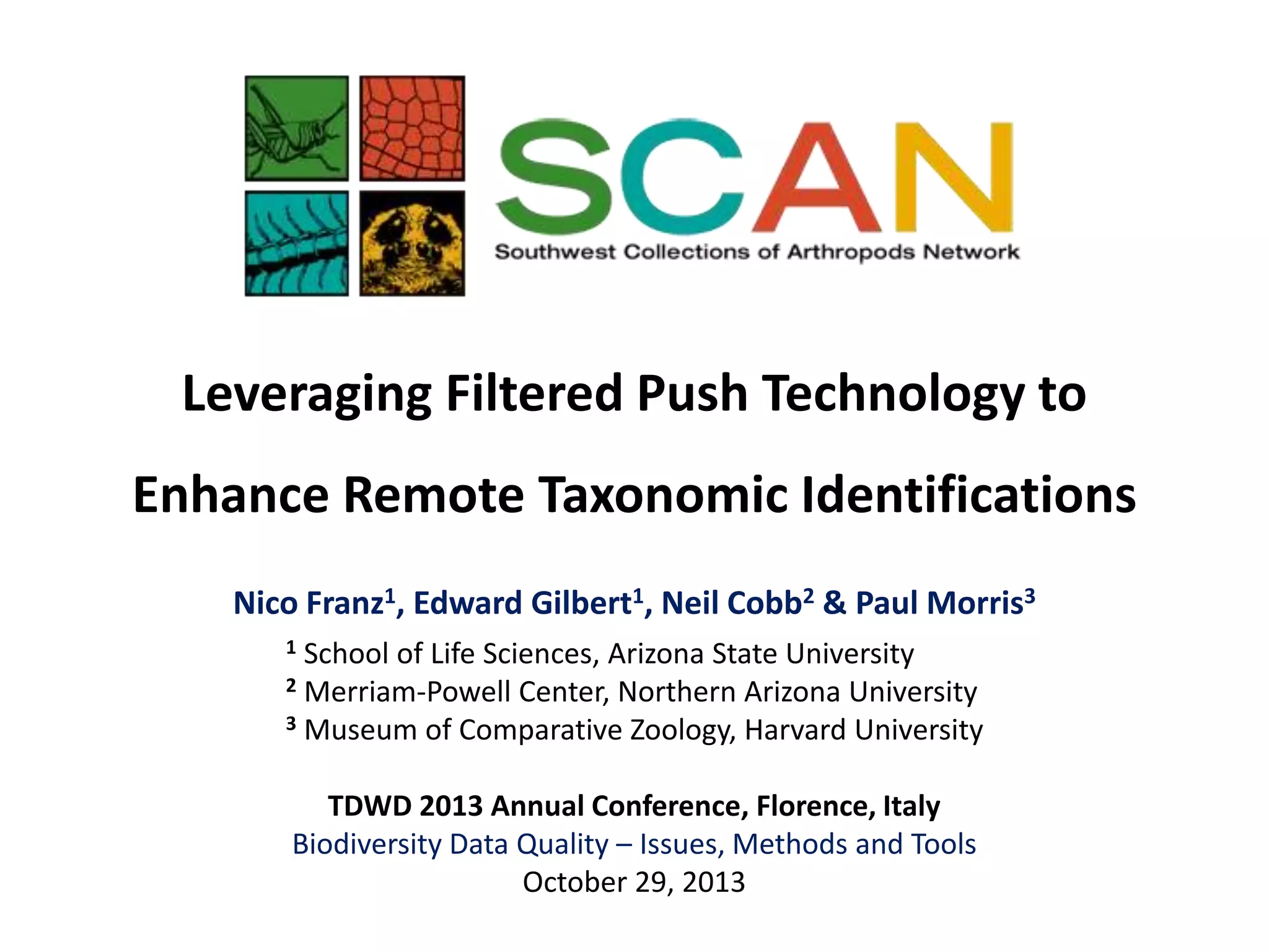 The document discusses leveraging filtered push technology to improve remote taxonomic identifications through the Symbiota platform, as part of the digitization of biodiversity collections. It highlights the objectives of digitizing records of southwestern ground-dwelling arthropods, including a target of 1 million records and 16,000 high-resolution images. The paper outlines ongoing work, the use of new client tools for annotation, and future plans for optimizing user interfaces and expanding the expert community within the project.