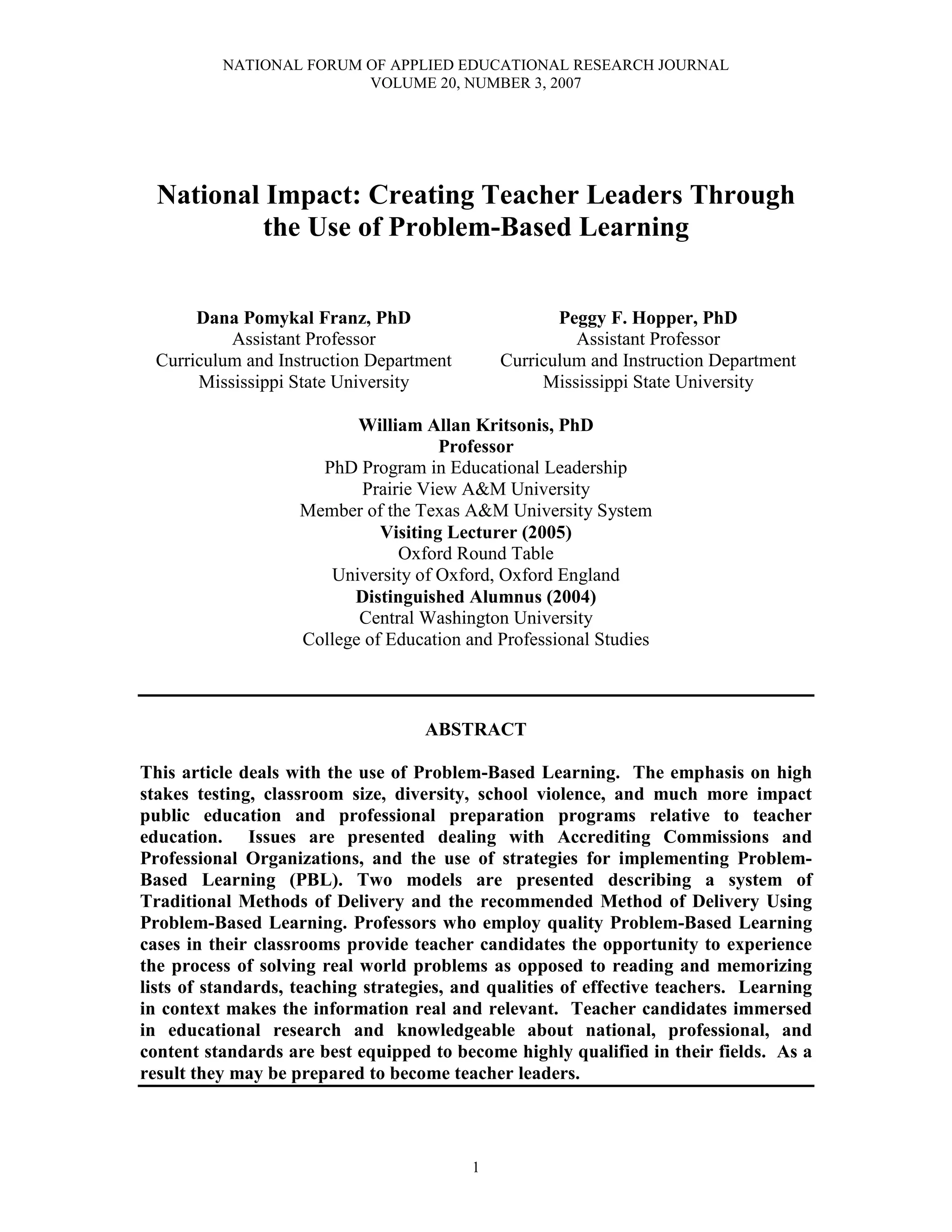 This document discusses the use of problem-based learning in teacher education programs. It notes that teacher education programs face many challenges in preparing teachers, such as high-stakes testing, classroom diversity, and scrutiny over teacher quality. Problem-based learning is presented as a way to better equip teacher candidates by having them solve real-world educational problems rather than just memorizing standards and strategies. Two models of instruction are compared, with problem-based learning argued to be more effective because it immerses students in research and helps them develop into teacher leaders better prepared to meet today's educational challenges.
