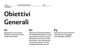 Il documento discute le strategie e le metodologie del Partito Democratico nel 2012 per organizzare il lavoro su social media, creando reti e gruppi specializzati. Gli obiettivi includono aumentare la visibilità online e coinvolgere gli utenti attraverso campagne efficaci su piattaforme come Twitter e Facebook. Viene enfatizzata l'importanza della narrazione e della memetica nella costruzione dell'immaginario collettivo e nella comunicazione politica.