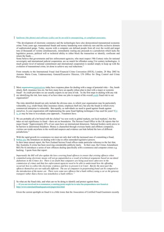 The document discusses the evolving nature of fraud in the context of e-commerce and organized crime, emphasizing the international dimensions of credit fraud and the inadequacy of existing legal frameworks to address these challenges. It highlights the need for organizations to enhance their response plans against systemic fraud and reviews various internal and external fraud threats businesses face today. Additionally, it presents case studies illustrating the complexities of fraud and underscores the importance of awareness and preventive measures for both organizations and individuals.