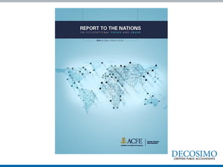 The document discusses fraud risks and provides examples of fraud cases. It discusses key steps to manage fraud risks including governance, risk assessment, prevention, detection, deterrence and response. It then summarizes several high-profile fraud cases including Rita Crundwell who embezzled $53 million from her small town as controller over 20 years through lack of segregation of duties and extravagant lifestyle. The document outlines common fraud schemes and techniques based on research from COSO and the ACFE. It discusses Donald Cressy's fraud triangle of perceived opportunity, incentive/pressure, and rationalization driving fraud. Finally, it provides charts on common financial statement fraud techniques and the distribution of fraud by category and median losses.
