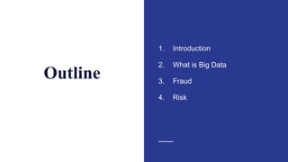This document discusses fraud and risk in the context of big data. It begins by defining big data and providing examples of how large companies like Walmart and Facebook handle massive amounts of data daily. It then discusses different types of fraud that can occur, such as credit card fraud and fraud on social media. Finally, it discusses risk management and how credit and market risk analytics are used to analyze past data to predict future risks. In summary, the document outlines the opportunities and challenges of using big data for fraud detection and risk management.