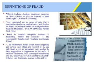 The document discusses fraud awareness for managers. It defines fraud and provides examples of regulatory definitions. It outlines factors that can contribute to fraud such as lack of controls and management oversight. The document emphasizes the importance of prevention through controls and establishes tone at the top. It lists behavioral and other red flags that could indicate fraud.