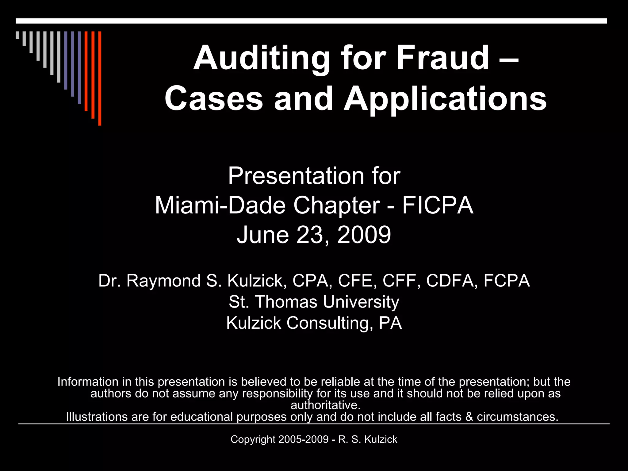 This presentation by Dr. Raymond S. Kulzick discusses the importance of auditing for fraud, outlining various types of financial statement fraud, and the relevant auditing standards (SAS 99). It highlights notable fraud cases and emphasizes the necessity for vigilance in the auditing process amidst changing economic conditions. The document concludes with insights into the risks associated with fraud and the implications for financial reporting.