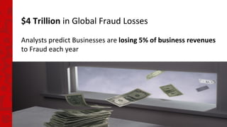 The document discusses the use of WSO2 Analytics Platform in fraud detection, highlighting that businesses lose approximately 5% of their revenues annually to various types of fraud. It emphasizes techniques such as machine learning, scoring systems, and Markov models for identifying fraudulent activities while attempting to minimize false positives. Additionally, it suggests leveraging interactive analytics for deeper insights into fraud patterns and connections.