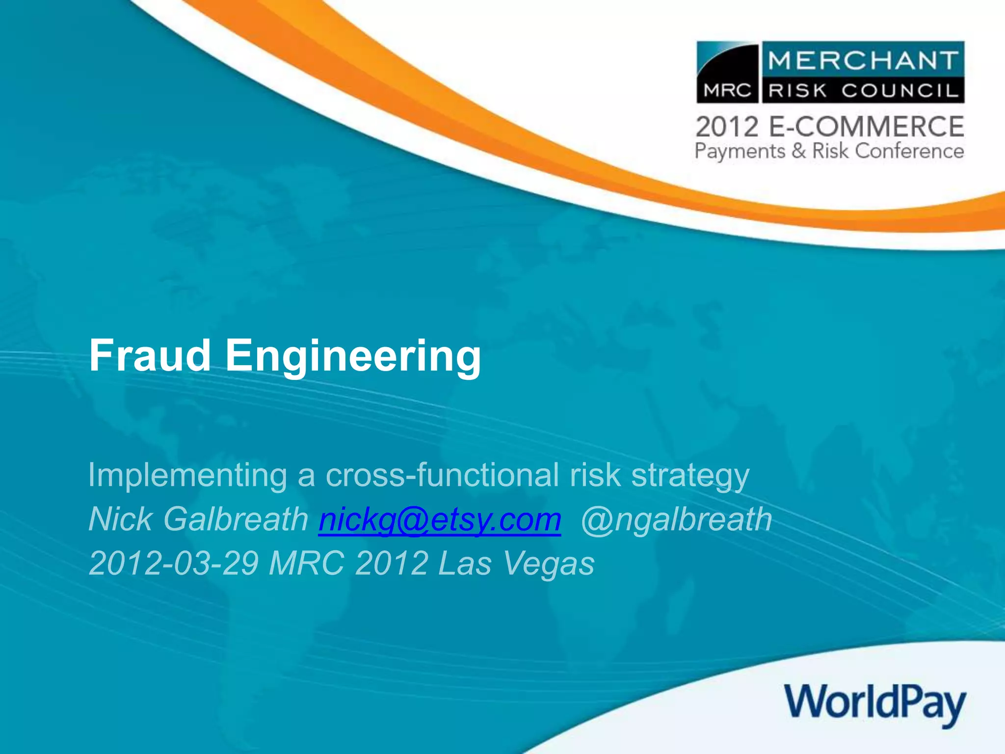 This document discusses fraud engineering at Etsy. It begins by introducing the author, Nick Galbreath, and his background in security. It then provides context about Etsy as an online marketplace. It outlines different types of risk like fraud, security threats, and business continuity. It emphasizes thinking about risk from both a fraud and security perspective. The document then provides examples of how different parts of the organization like technical operations, quality assurance, product, business operations, engineering, and customer service can work together on fraud prevention and leverages their existing tools and resources. It also provides a case study example of investigating mysterious data center logins. The overall message is about taking a holistic organizational approach to fraud engineering.