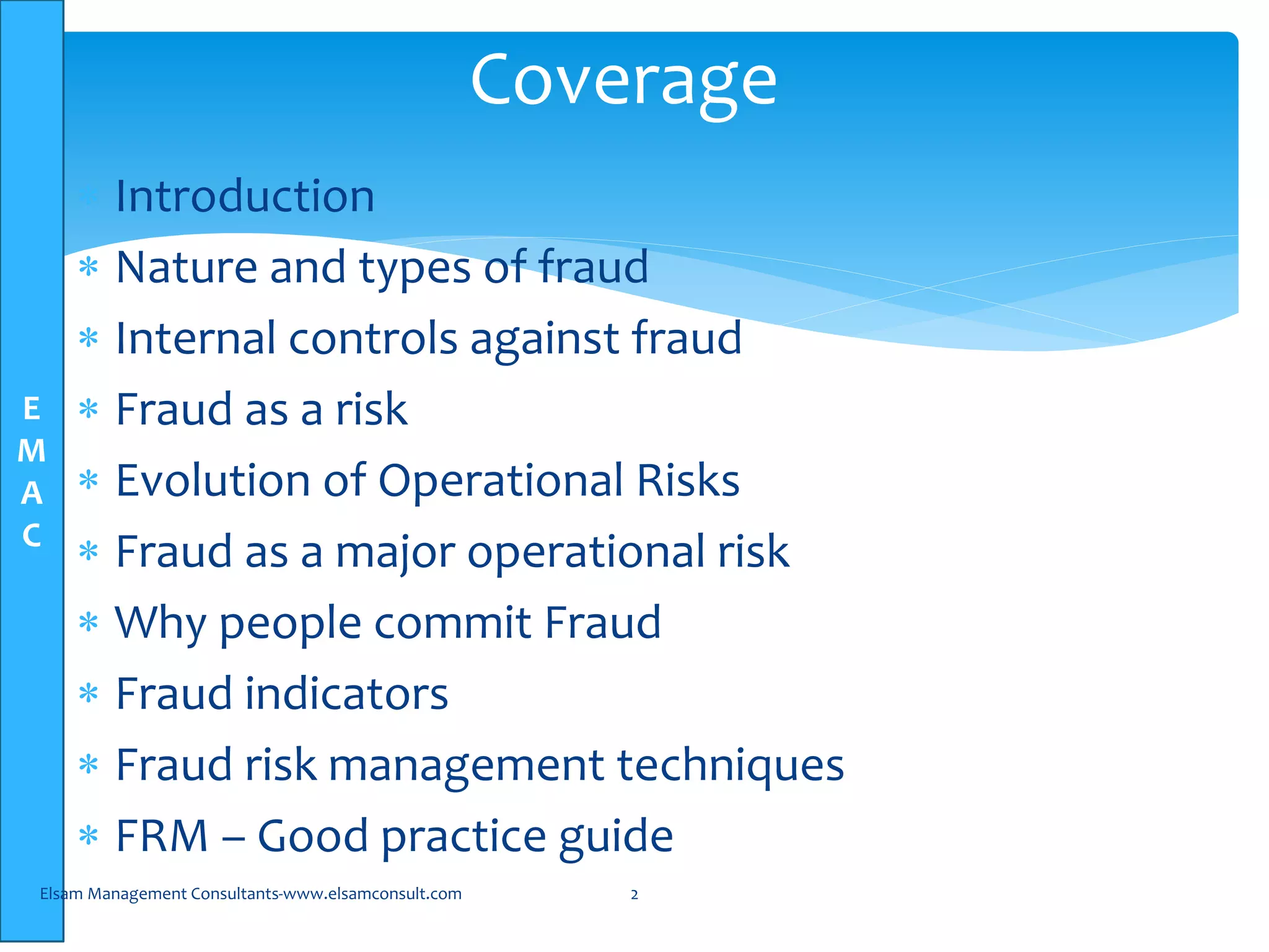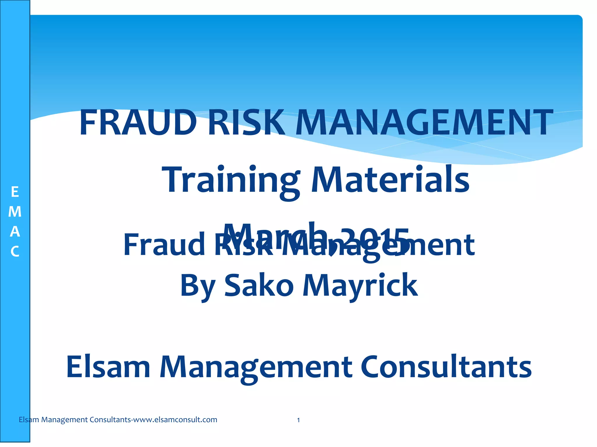 This document discusses the importance of fraud risk management, highlighting the various types of fraud, including theft and corruption, and the internal controls necessary to combat them. It outlines the factors leading to fraud, such as pressure, opportunity, and rationalization, and identifies key indicators signaling potential fraud risks within organizations. Furthermore, it emphasizes the need for formal systems and ongoing training to effectively prevent, detect, and respond to fraud.