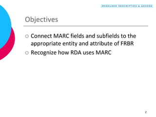 This document discusses how MARC 21 fields relate to FRBR entities and RDA attributes. It provides examples of how attributes of works, expressions, and manifestations are recorded in MARC fields and explains how RDA differs from AACR2 in its conceptual model and treatment of access points. New fields are introduced in RDA to record attributes at the work, expression, and manifestation levels in a more granular way. Relationships between entities are conveyed through notes and linking fields.