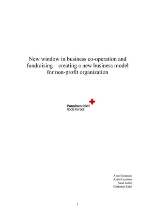 This document proposes strategies for creating a new business model for non-profit organizations. It summarizes surveys conducted on awareness of the Finnish Red Cross (FRC) products and first aid courses. It finds low visibility and awareness of FRC offerings. The document analyzes FRC using the McKinsey 7S framework and proposes several marketing strategies including increased use of social media, guerrilla marketing, improved pricing, and bundling of products and services. It emphasizes the need for improved visibility, findability, and customer relationship management for FRC.