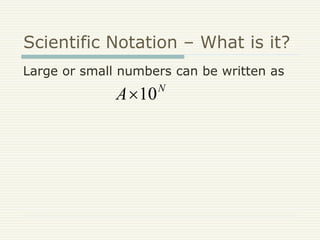 Scientific notation is a way to write large or small numbers as a number between 1 and 10 multiplied by a power of 10. The document provides instructions on homework for scientific notation, including looking at examples and practice problems in the textbook, filling in tables, and completing 10 problems and an online assignment to reinforce understanding of scientific notation concepts.