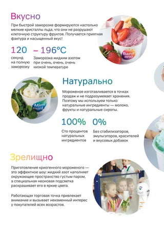 Документ описывает молекулярное мороженое, приготовленное с использованием жидкого азота, что улучшает текстуру и вкус благодаря быстрому замораживанию без использования искусственных добавок. Основные ингредиенты — это натуральное молоко, фрукты и сиропы, без стабилизаторов и красителей. Также представлены различные форматы торговых точек, включая стационарные и мобильные, а также информация о франшизе.