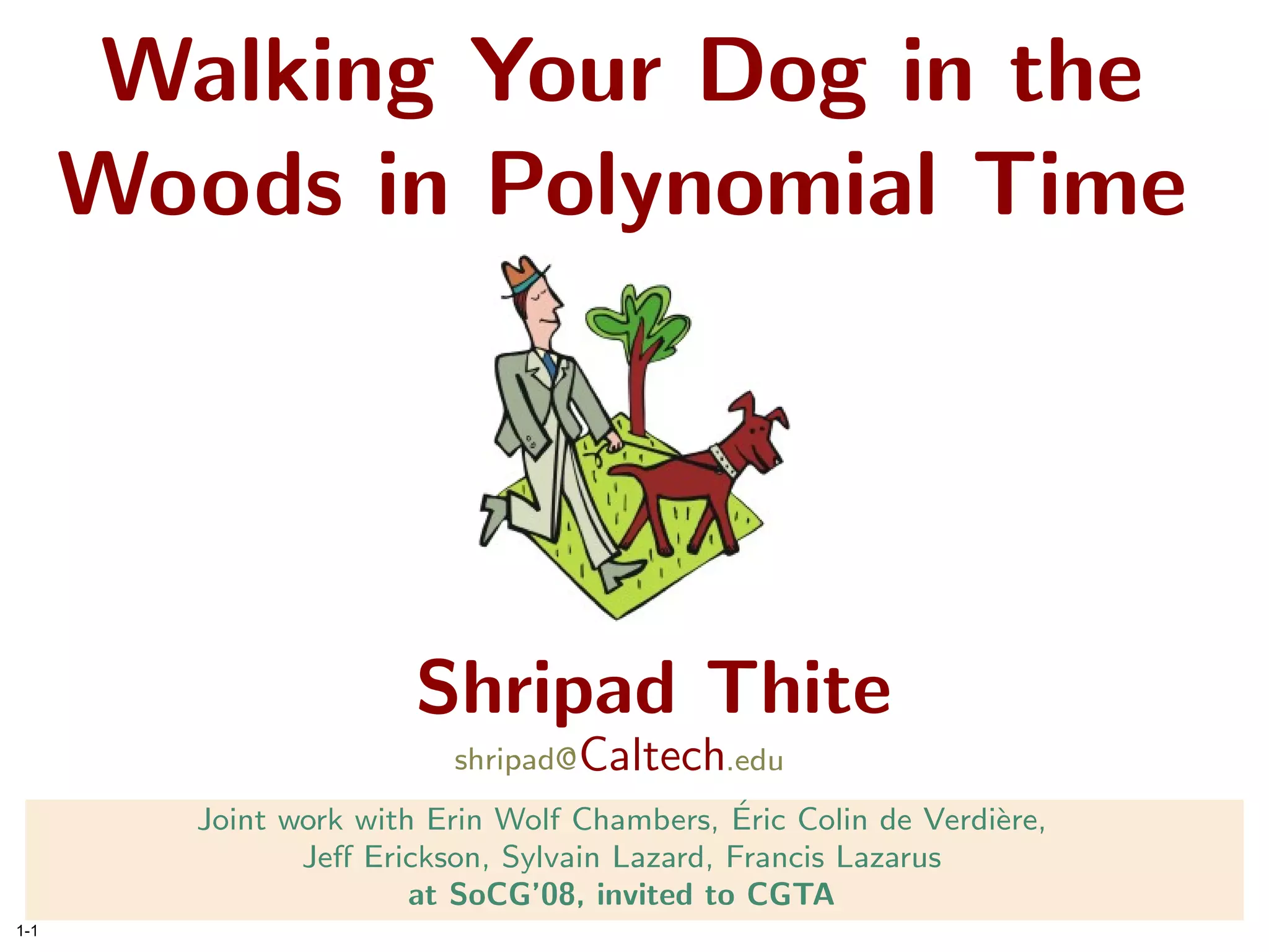 The document discusses the concept of walking a dog along two curves in a continuous manner, while maintaining a leash, and introduces the Fréchet distance as the minimum leash length required for such a walk. It further explores the complexities introduced by obstacles and presents a polynomial-time algorithm to compute the homotopic Fréchet distance between polygonal curves in a punctured plane. The paper concludes with insights into the optimal leash paths and includes details on algorithms for specific conditions involving point and polygonal obstacles.