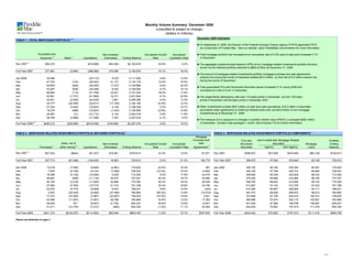 This document provides a monthly summary of Freddie Mac's mortgage portfolio for December 2008. Some key highlights include: - The total mortgage portfolio increased 4.1% in December to $2.207 trillion, with an annualized growth rate of 5.0% year-to-date. - The mortgage-related investments portfolio declined 0.1% to $804.8 billion in December. - Total guaranteed PCs and structured securities issued increased 4.1% in December. - The single-family delinquency rate was 172 basis points in December, up from 152 basis points in November.